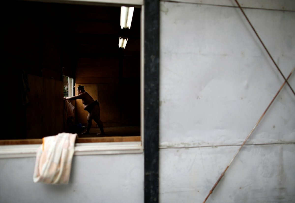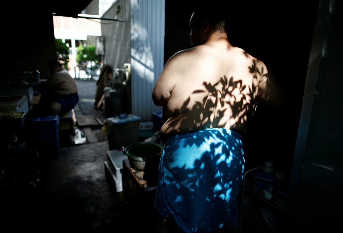 Фотографу Иссеи Като было предоставлено редкое разрешение документировать повседневную жизнь сумоистов, временно размещенной в буддийском храме перед турниром.