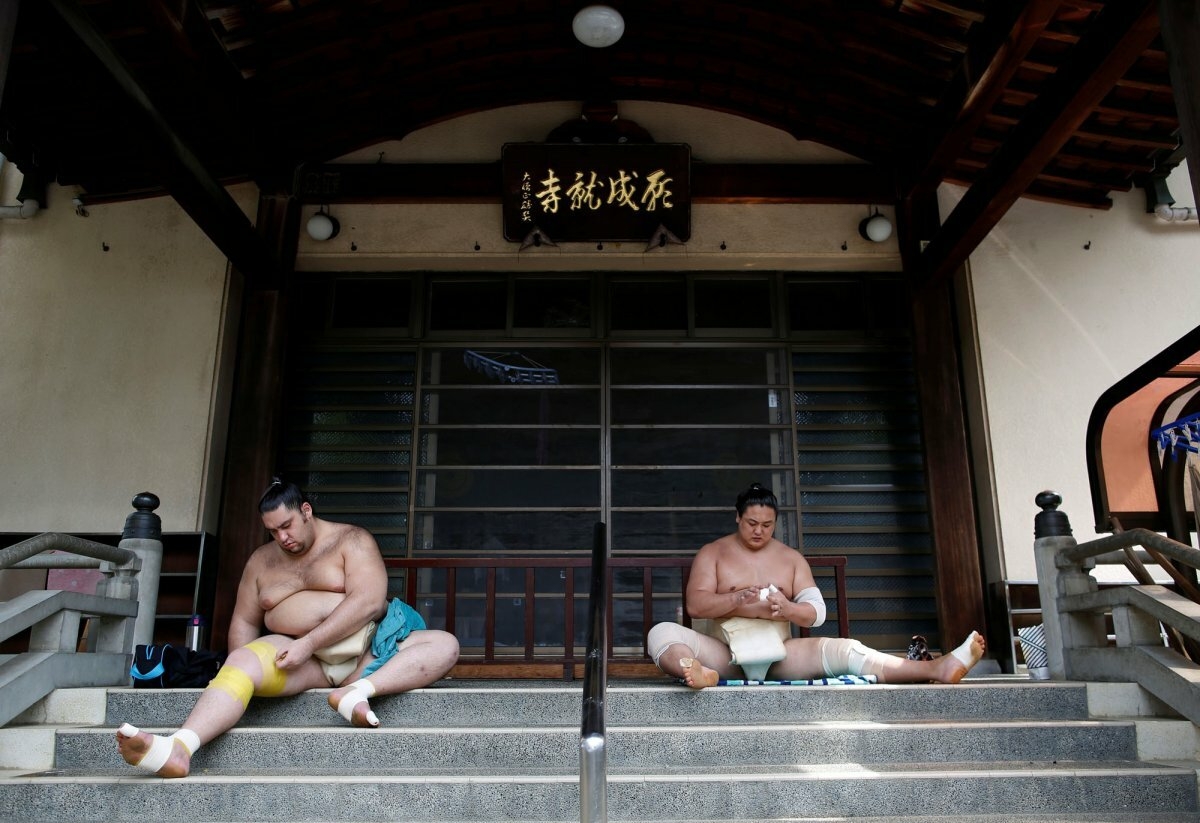 7. Для турнира Град-Сумо в Нагоя сумоисты получили ременную базу в буддийском храме.