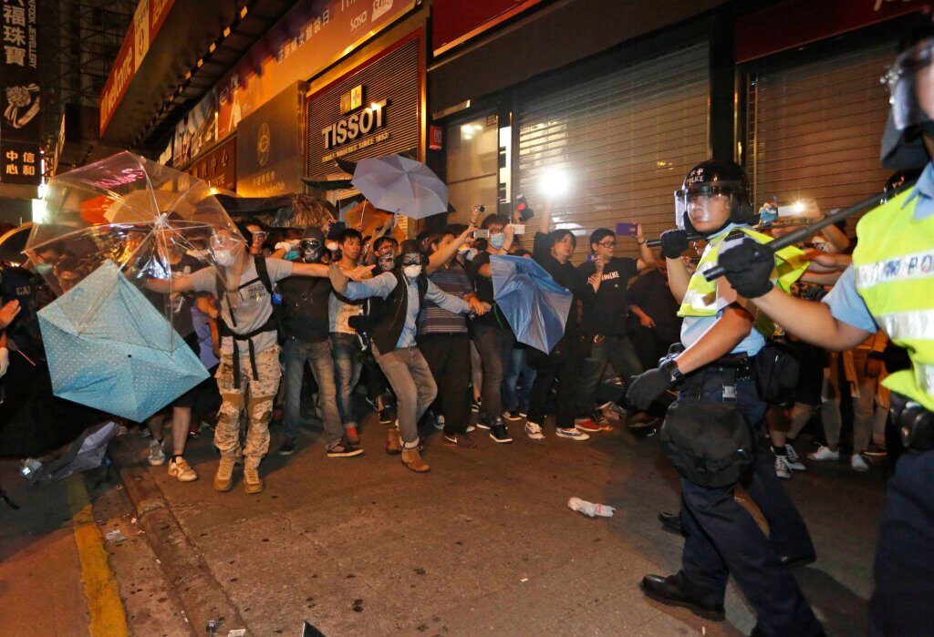 14. Ночные столкновения демонстрантов с полицией в районе Mong Kok на полуострове Kowloon в Гонконге. (Фото: KIN CHEUNG/AP).