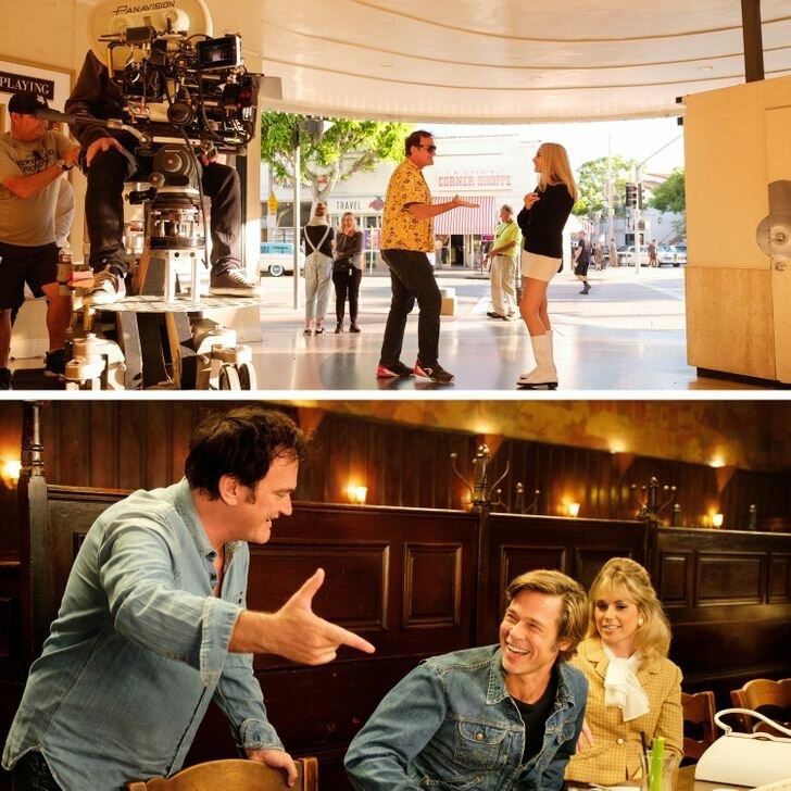 10. Квентин Тарантино дает Марго Робби и Брэду Питту инструкции о том, что делать на съемочной площадке «Однажды в Голливуде».