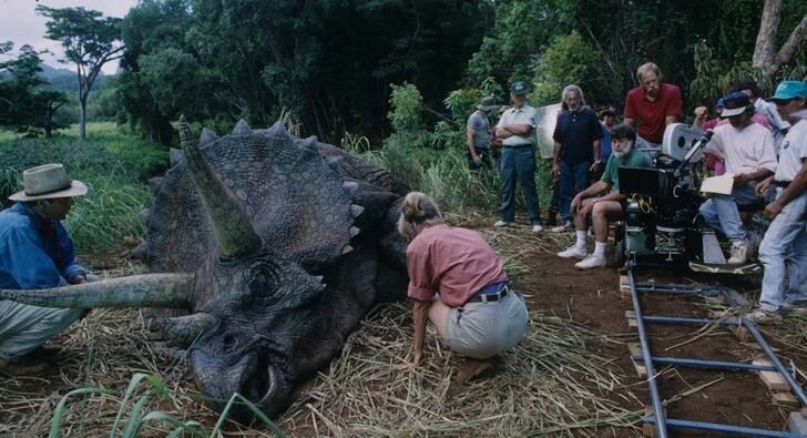 12. Лаура Дерн, Сэм Нил и Стивен Спилберг на съемках «Парка Юрского периода».