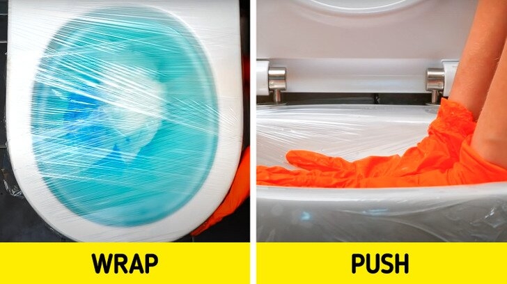 3. Если ваш унитаз полностью засорился, попробуйте этот трюк. Плотно накройте унитаз полиэтиленовой пленкой, чтобы внутрь не попал воздух. Затем смойте. Когда пленка начнет подниматься вверх, надавите на нее.