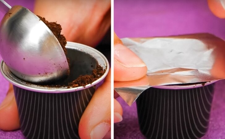 6. Еще одна отличная идея — повторно использовать уже использованные кофейные капсулы. Любимую кофейную гущу положите внутрь капсулы и накройте ее кусочком фольги.