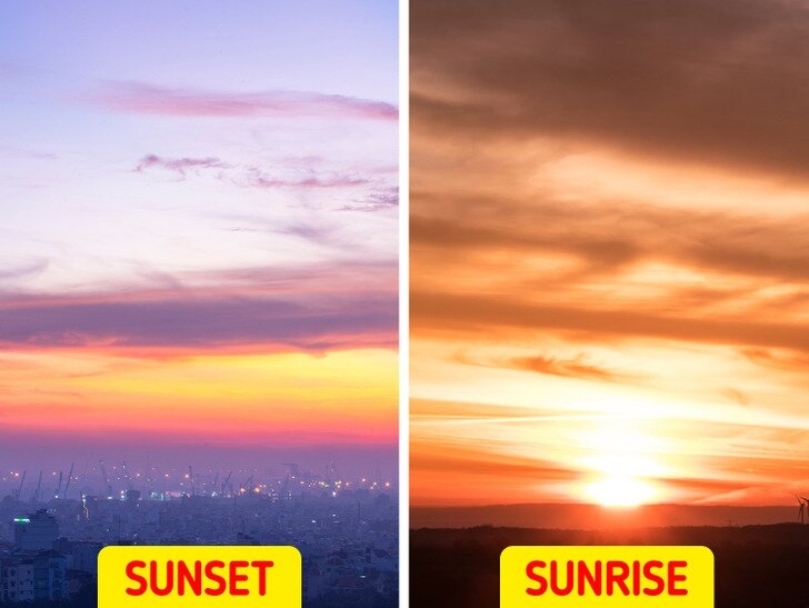8. Почему закат и восход солнца выглядят по-разному? Можете ли вы найти разницу между закатом и восходом солнца, помимо восходящего и нисходящего тренда солнца? Вы, наверное, заметили, что они имеют разные цвета. Объясняется это тем, что путь лучей в сумерках и на рассвете намного длиннее, чем днем. Прежде чем солнечный свет достигает наших глаз, более короткие волны рассеиваются, и мы видим такие цвета, как желтый, оранжевый, красный во время заката. Однако на восходе темнота ночи оставила нам очень острое ночное зрение, и каждое слабое, незначительное изменение цвета неба было очевидным. Таким образом, мы воспринимаем больше цветов на рассвете, чем в сумерках.