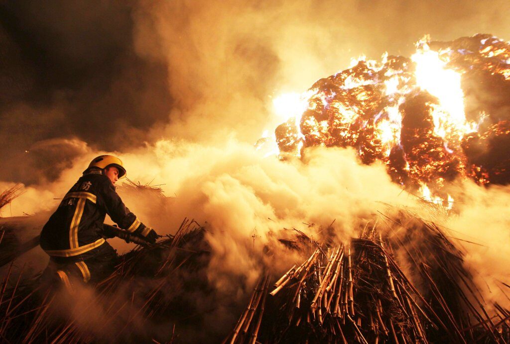 6. Пожарный пытается потушить огонь, который вспыхнул на бумажной фабрике в Чандэ, в провинции Хунань, в Китае. (Фото: CHINA STRINGER NETWORK / REUTERS ).