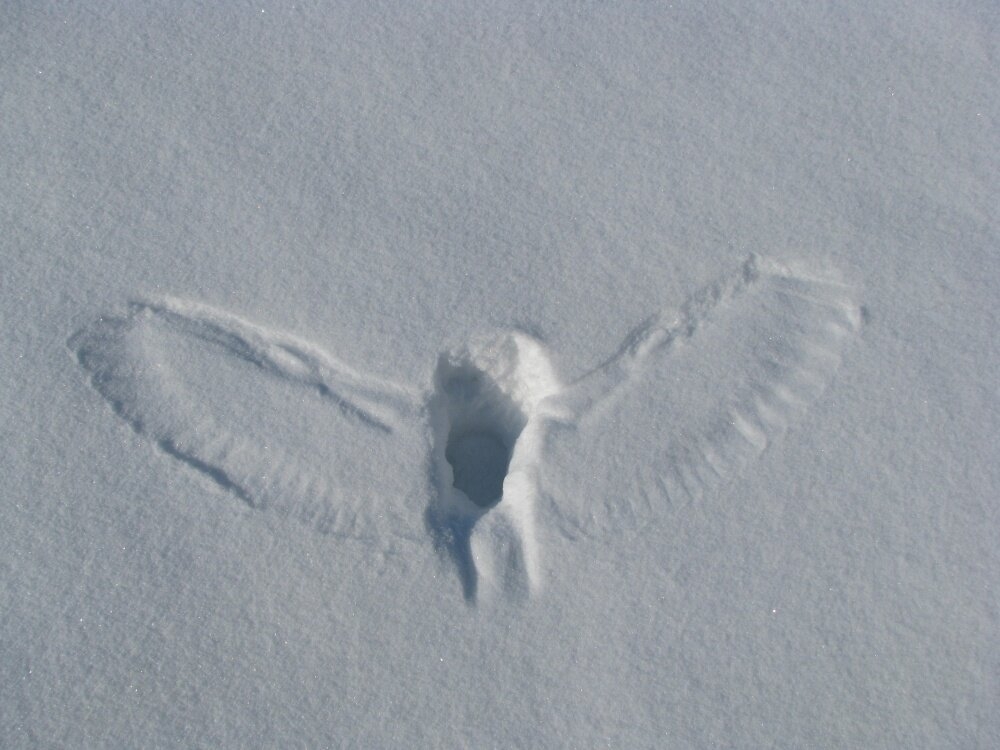 След совы, ныряющий в сугроб, чтобы поймать свою добычу.