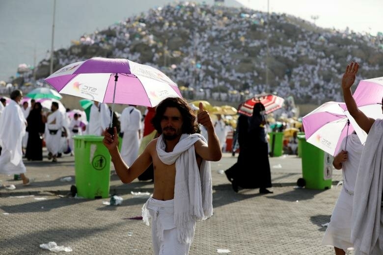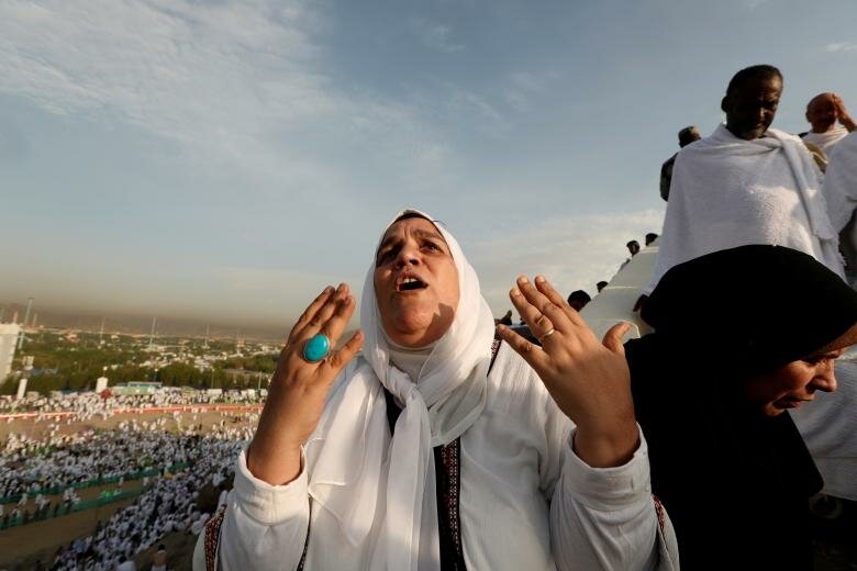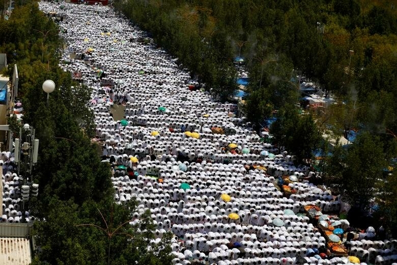 2. Мусульманские паломники прибывают, чтобы помолиться за пределами мечети Намиры на равнинах Арафата.