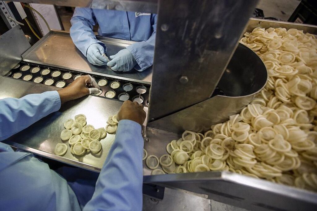 9. Проверка размеров презервативов из новой партии. (Фото: PAP/EPA/AZHAR RAHIM).